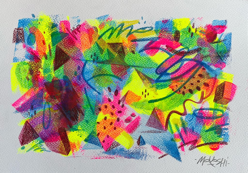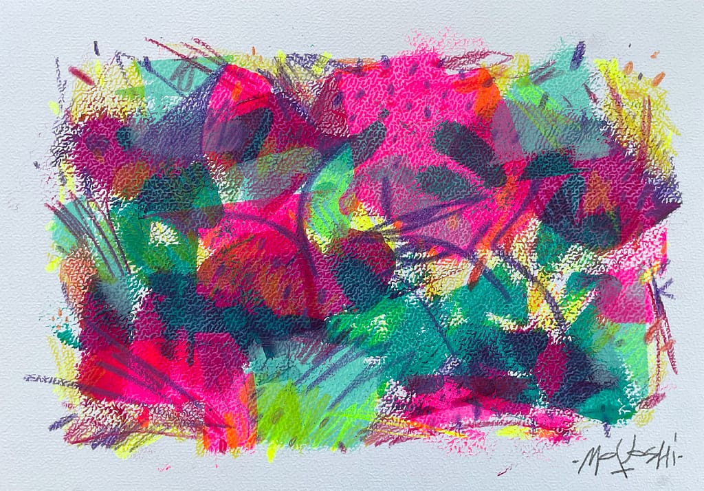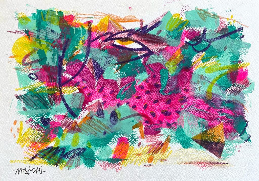 À la frontière entre le visible et l’invisible, il y figure des animaux en voie d’extinction et dont la disparition marque notre finitude. Autour d’eux, il développe un style aux techniques mixtes : pastels et acryliques abandonnent la figuration pour un jeu d’équilibre entre formes, lignes et couleurs, qu’il aime préparer lui-même et qu’il répertorie dans un nuancier.