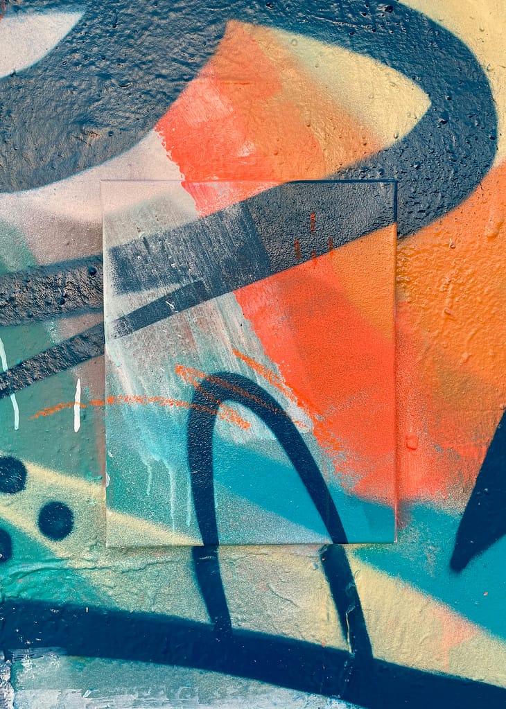 Tout commence par une toile accrochée sur un mur. Puis vient la couleur et ces tracés organiques et séquencés. Une fois la fresque terminée, les deux éléments ne font qu’un, créant le lien entre toile et mur, entre béton et fibres de lin. La toile décrochée devient une œuvre unique faisant partie d’un projet global « fragment de fresque », qui transpose le travail d’atelier dans la rue et inversement.